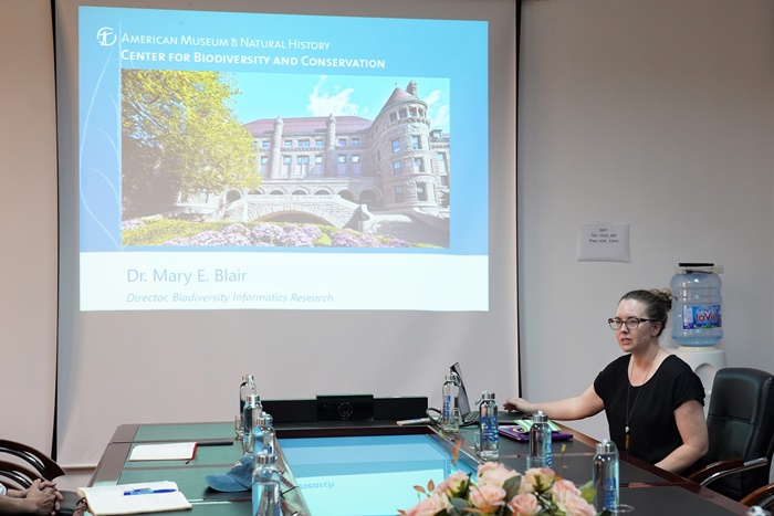 Tiếp đón và trao đổi với TS. Mary Blair, Giám đốc Trung tâm Nghiên cứu bảo tồn Đa dạng sinh học, Bảo tàng Lịch sử Tự nhiên Hoa Kỳ có GS.TSKH. Vũ Hoàng Linh, Hiệu trưởng Trường ĐHKHTN; PGS.TS. Ngạc An Bang, Phó Hiệu trưởng Trường ĐHKHTN; lãnh đạo Khoa Sinh học; lãnh đạo Phòng Hợp tác Phát triển và Phòng Quản trị – Bảo vệ cùng PGS.TS. Lê Đức Minh, Khoa Môi trường.